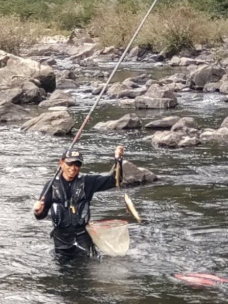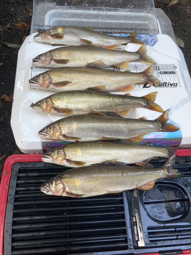 釣り開始後はやはり追いが悪くポツリポツリと掛かりますがオトリごろサイズの25cmクラスが多く大型は厳しい感じのため、他の人が狙わない超深場や普段の水位では釣りがしにくいポイントを攻めていき、2日間で60匹ぐらい?泣き尺数本と31.5cmを含む尺鮎5本を獲ることが出来ました。