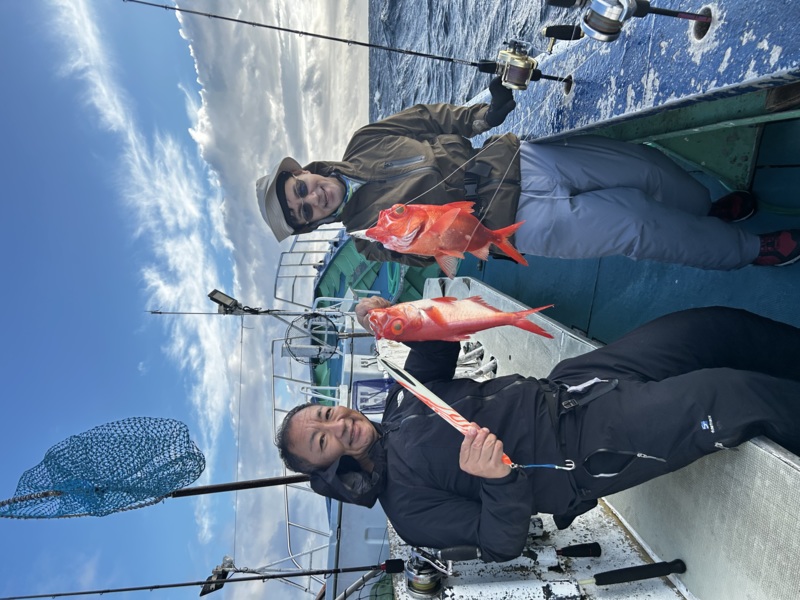 水深350m、この日は風波強く、ジグ1000gでスタート。海底から30m程をスローピッチで探り、フォールを入れるとロッドティップにクンツと小さなアタリがあり、大きく巻き合わせるとグゥオングォンと魚振が伝わり、朱色の新島キンメが上がって来ました。 薄暗い時間が釣り易く、フックアウトや根掛かりを回避することが重要でした。フックは根掛かりしにくいネムリ鈎や、身切れを防ぐ丸軸、根掛かり時に鈎先で折れたり、変形する物等工夫が必要でした。 ポツポツとキンメのヒットはあり、良型のでクロムツもヒットしました。しかし、大きなウネリので中では、慎重に巻き上げて来ても、ジグだけ上がって来る事も多々でした。 最大水深で460m、ジグは1300gまで投入する事もあり、4人全員ヒットの時合いもあり、キンメ14匹キャッチとなりました。夏潮が終わり、秋のキンメシーズン開幕です。体力も必要釣りですが、釣り上げた後の疲労感は格別です。伊豆は温泉も多く、食と合わせた、釣りの旅いかがでしょうか?