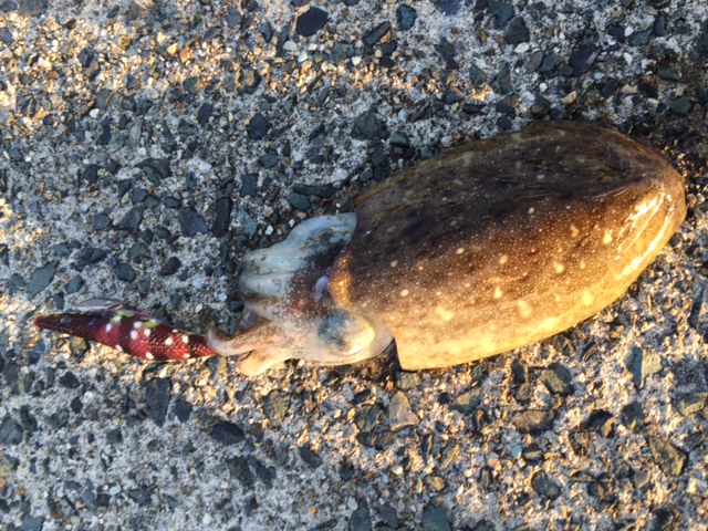 9月28日に日本海の伊根・養老エリアにエギングに行ってきました。夜中の3時に釣り場に到着したのですが、すでに堤防は釣り人でいっぱいでした。なんとか場所を確保し釣りスタート!回りを見ているとポロポロと釣れていす感じでした。そうこうしているうちにHIT!!シャクったらノッテたパターンです(~~)でも、サイズは胴長20cmとナイスサイズ☆このまま波に乗って行こうと思いましたが、アタリが続きません・・・。移動も考え始めたころに夜明けになり、アタリが出始めました!!時合いって大切ですよね☆この場所では5杯GET(内1杯はコウイカ)し、次の場所へ、しかーし・・・どこへ行っても人だらけ・・・。エギング人気を実感しながら小磯のポイントへ入る事ができ、2回戦スタート!!よーく見てみるとイカを発見!!サイトで探ってみると反応するではありませんか、丁寧に探って5杯追加しました。使用したエギは、エギ王Q LIVEサーチとエギ王Q LIVEです。まずはLIVEサーチで探ってみて、スレたらLIVEで誘うってパターンでした。カラーは下地が虹テープがオススメです☆是非、エギングに行く際には、1つ・・・いや、2つは持って行って見て下さい。お役に立つと思いますよ!!