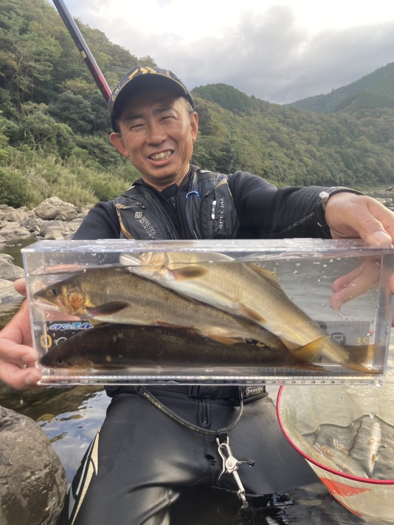 釣り開始後はやはり追いが悪くポツリポツリと掛かりますがオトリごろサイズの25cmクラスが多く大型は厳しい感じのため、他の人が狙わない超深場や普段の水位では釣りがしにくいポイントを攻めていき、2日間で60匹ぐらい?泣き尺数本と31.5cmを含む尺鮎5本を獲ることが出来ました。