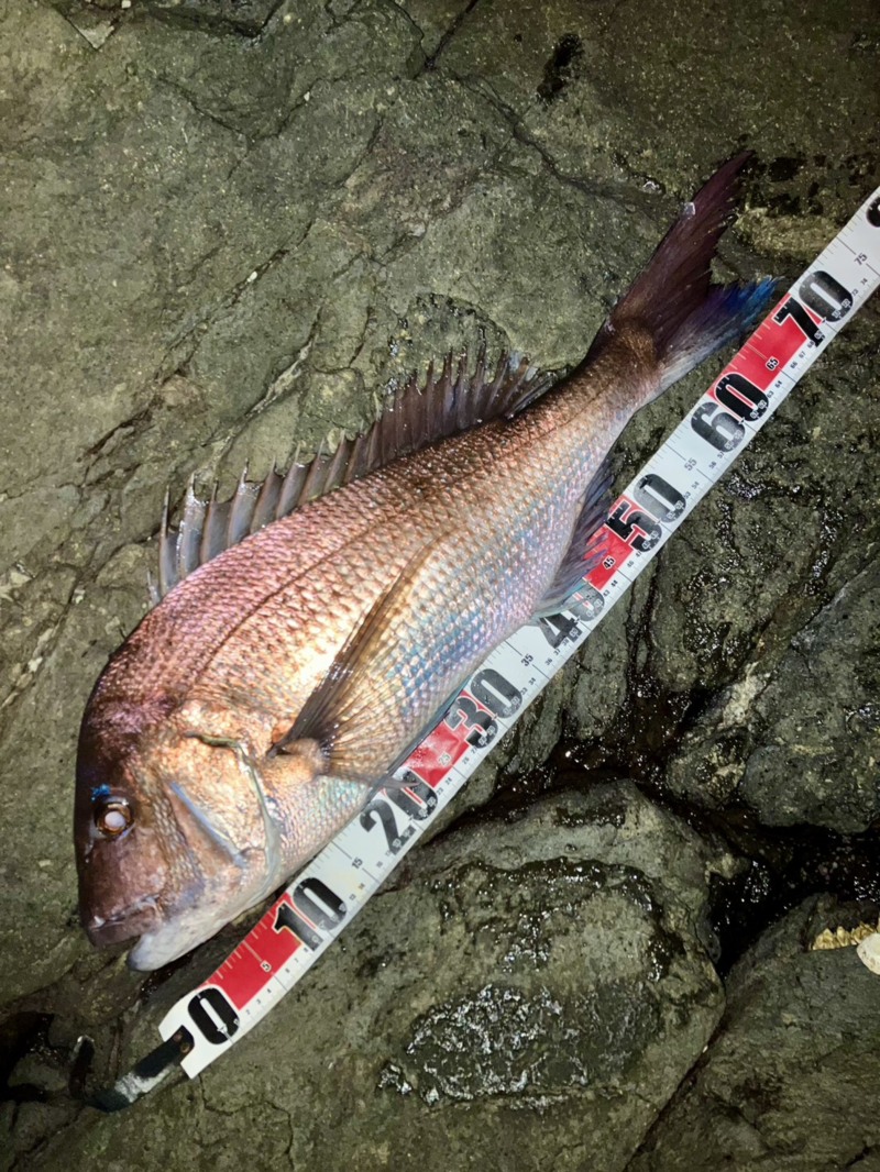 明るい内に下調べしたポイントに仕掛けを留めておくと...猛スピードで電気ウキが消し込み...マダイの釣果。