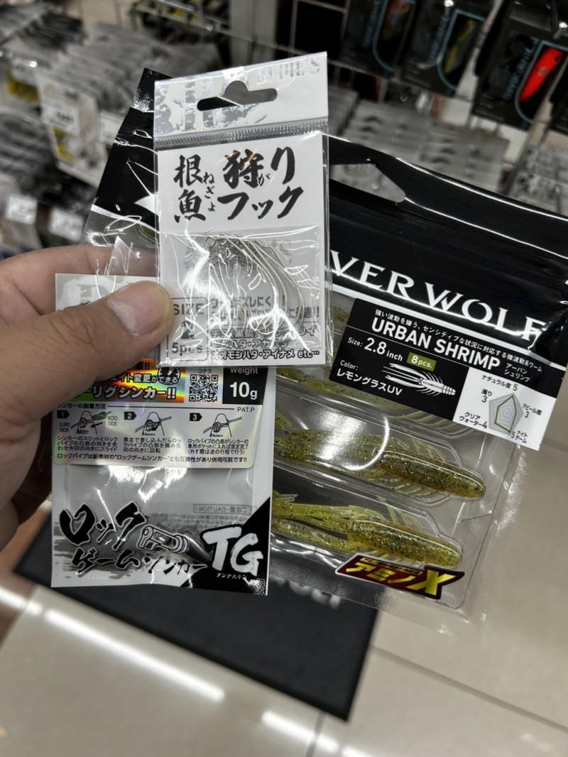 使用したルアーはダイワの「アーバンシュリンプ2.8」の今年の新色「レモングラスUV」日中に便利なケイムラカラーにルーディーズの「ロックゲームシンカーTG 」のフリーリグ構成です。