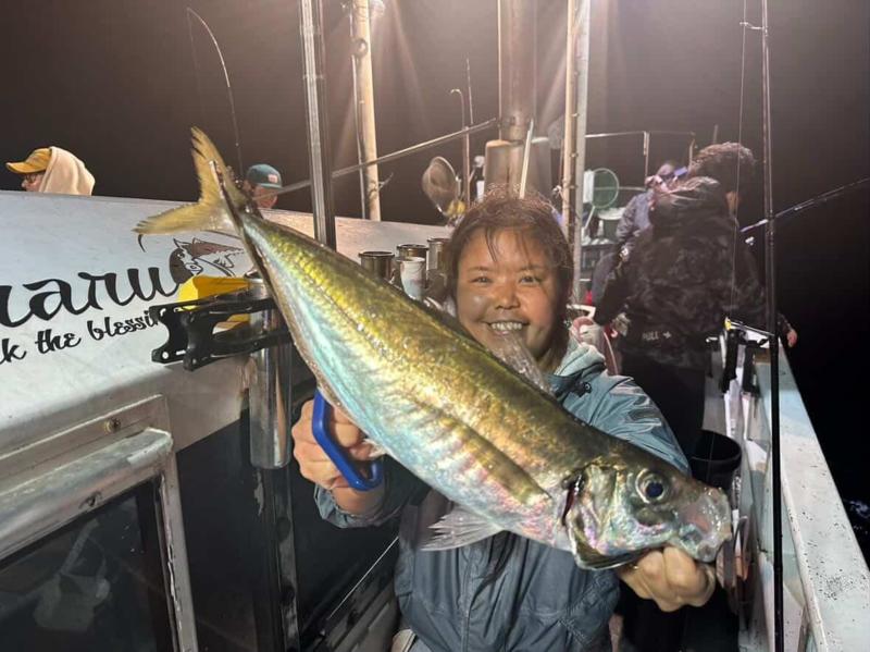 日をまたぐ頃に潮が変わり、スタッフ小川とお客様の竿にもHit!