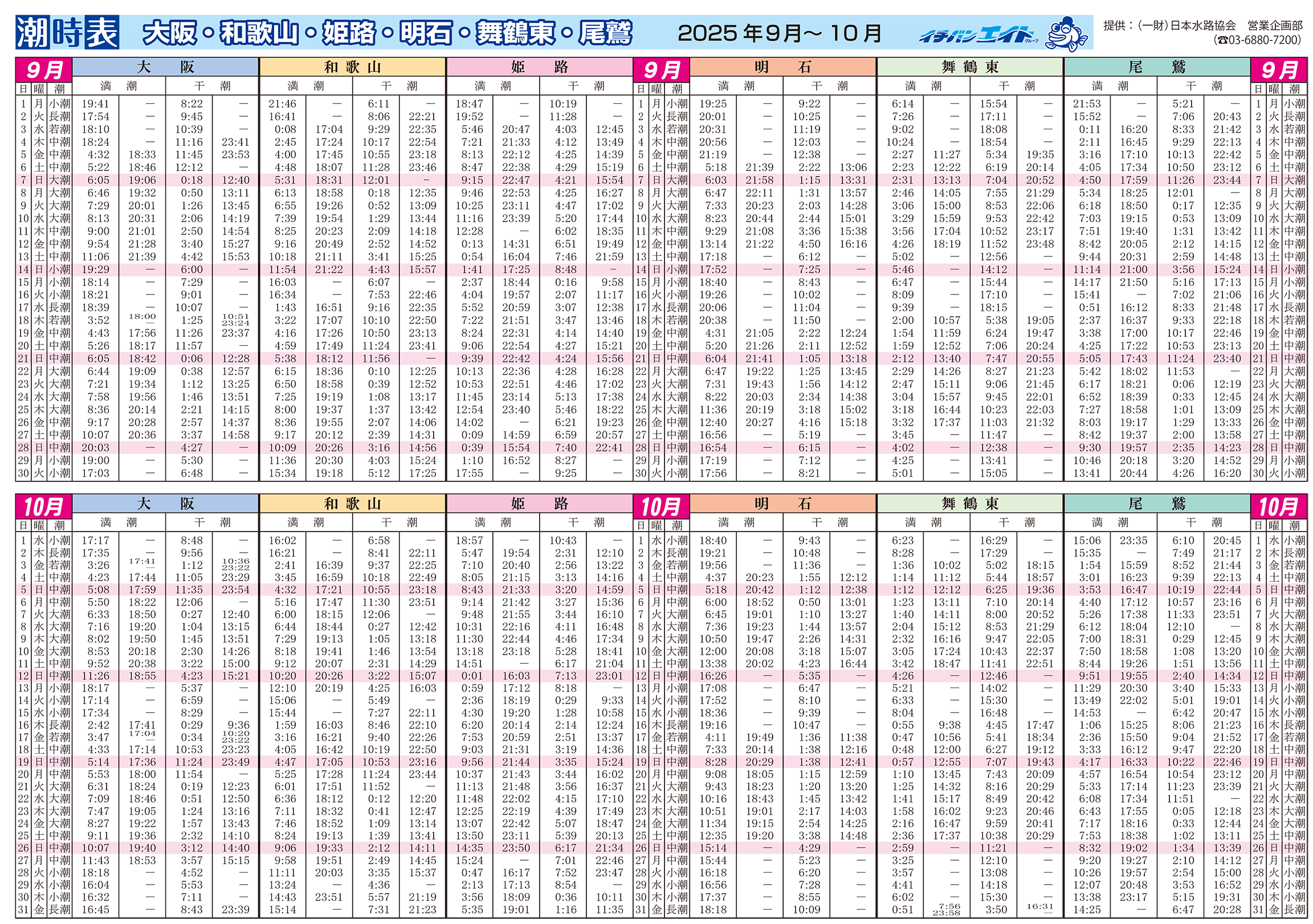 2026 潮時表 大阪・和歌山・姫路・明石・舞鶴・尾鷺