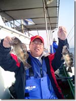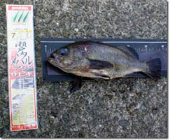 | 船長より底から5mぐらいまでメバルが映っていると言われ、 底から1m程きってみると、小さなあたりがあり、追い喰いさせる為、そのまま待っていると、竿先が水中に引き込まれるようなあたり。あげてみると一番上の針と一番下の針に2匹かかっていました。今回は、かなりメバルが浮いていたようで、幅広く棚をさぐった人が釣果を上げていたようです。