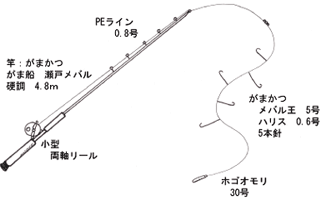 淡路島東浦沖で釣り開始。今回の私の仕掛は、がまかつメバル王5号にホゴオモリ30号を付け、 エサは、船で用意していただいたシロウオを使用。開始後すぐ、サビキ仕掛を使っていたエイト3の竹沢が大きく竿を曲げており、
