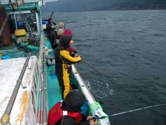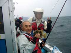 ひと流し目の7時20分、左舷側の西田氏が第1投目からカワハギをゲット。村田名人も負けじと1尾、2尾と釣りあげる。右舷側では菱田氏がカワハギならぬガシラをダブルで釣った。 ふた流し目。左舷側の木村氏が一尾目。左舷側では明渡氏が大きなカワハギを釣りあげ、船頭のたくみな操舵もあってか両舷共にカワハギをボツボツ釣る。 当日の参加者の中には、まったくのビギナーもいるので、村田名人は3尾目を釣ったあと、各釣座を回ってアドバイス。とくにビギナーには、誘い方、アタリの取り方などをていねいにレクチャーしていた。 そのかいあってか、2時間ほどは1尾も釣れなかった人が見事に1尾釣ったかと思えば、続いて2尾、3尾と釣りあげ、納竿時には9尾も釣ってコツをマスター。「カワハギ釣りにハマリました」と話していた。 当日は、風、波、雨という釣り辛い中、白崎沖の水深30−40メートルを釣ったが、3人同時にカワハギを釣ったり、1人でダブルを釣るシーンも見られた。村田名人の話では、当日は誘ったあと、ジッとしばらく待つのがよかったといっていた。 |