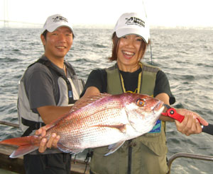 利弥丸 大窪船長の指導の元、上がってきたのは、50cmオーバーの立派な鯛。