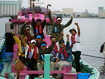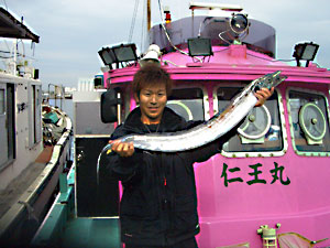 アタリが出た。この時が合わせのタイミングで、大きなテンヤ針がタチウオにしっかりと掛かるように大合わせをする事もポイントである。上がって来たのは全長80cmの良型タチウオで、まわりのスタッフも次から次に竿を曲げ、今年のタチウオの魚影は濃いとは聞いていたが、午前11時頃までの釣果は一人5〜10匹と好調であった。