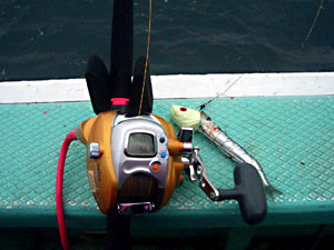 朝6時、泉佐野食品コンビナート港を出港し、タチウオの好ポイント、神戸沖まで走り、テンヤ仕掛けにエサのイワシを付けて投入。水深は80〜50m。まず、底を取り、2mほど巻き上げて、竿をシェイク。これでアピールが高まり、止めた瞬間にアタリが出る事もある。アタリがない時は電動リールの巻上げレバーをスローに合わせ中層まで巻上げ、アタリがない時は再度落下させ底取りからのやり直しとなる。 シェイクの後、スローで巻き上げていると「コツコツ」とアタリが。すぐには合わさず巻上げを続けると次に大きな喰い込み